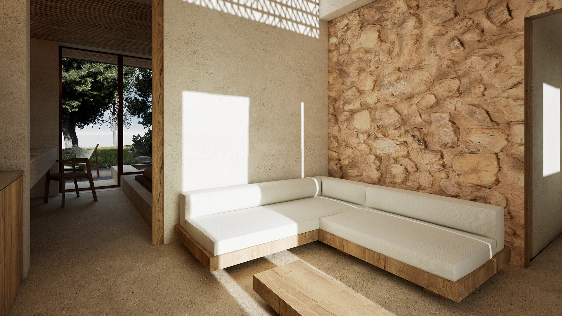 A ground floor two-room suite offering comfort and relaxation in a natural setting. It features two separate spaces: a bedroom with a double bed and a second room with two single beds, ideal for families or small groups.